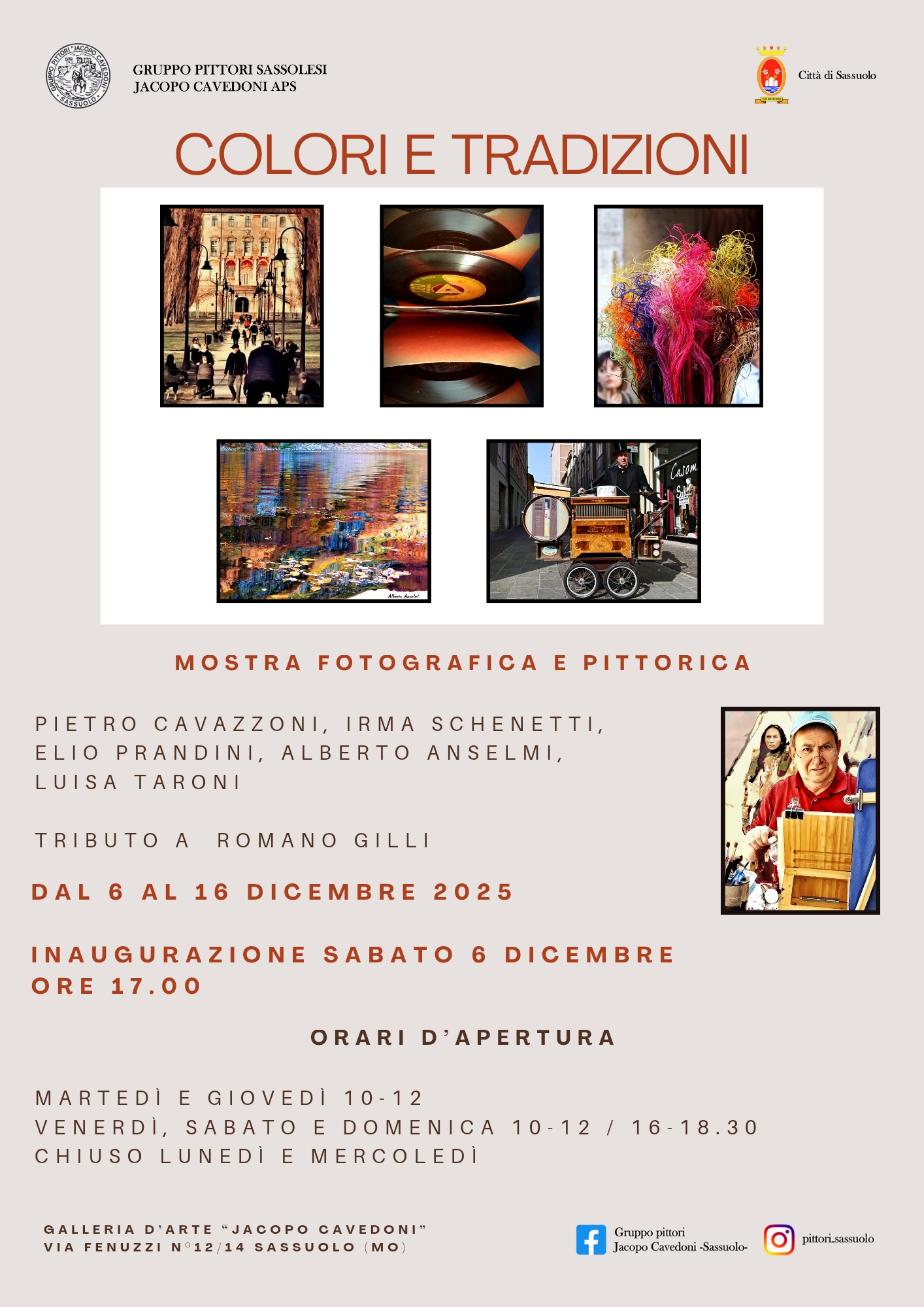 Il Gruppo Pittori Sassolesi Jacopo Cavedoni APS, con il patrocinio della Città di Sassuolo, presenta la mostra “Colori e Tradizioni”, un percorso tra pittura e fotografia che celebra l’arte come linguaggio senza tempo.