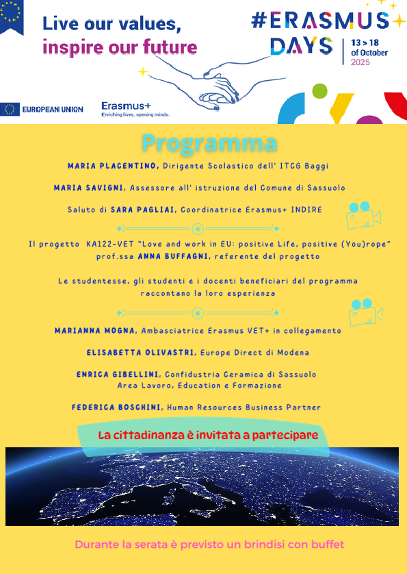 L’I.T.C.G. Alberto Baggi e la Città di Sassuolo invitano la cittadinanza a celebrare l’esperienza Erasmus con un evento speciale dedicato a studenti, docenti e famiglie.