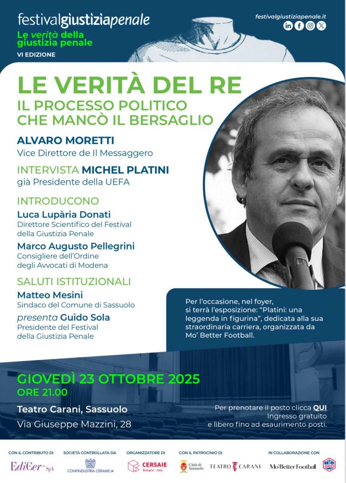 Giovedì 23 ottobre alle ore 21, nella splendida cornice del Teatro Carani, a conclusione del Festival della Giustizia Penale 2025, appuntamento con protagonista Michel Platini, che racconterà “La verità del Re. Il processo politico che mancò il bersaglio” in dialogo con Alvaro Moretti, vice direttore de Il Messaggero.