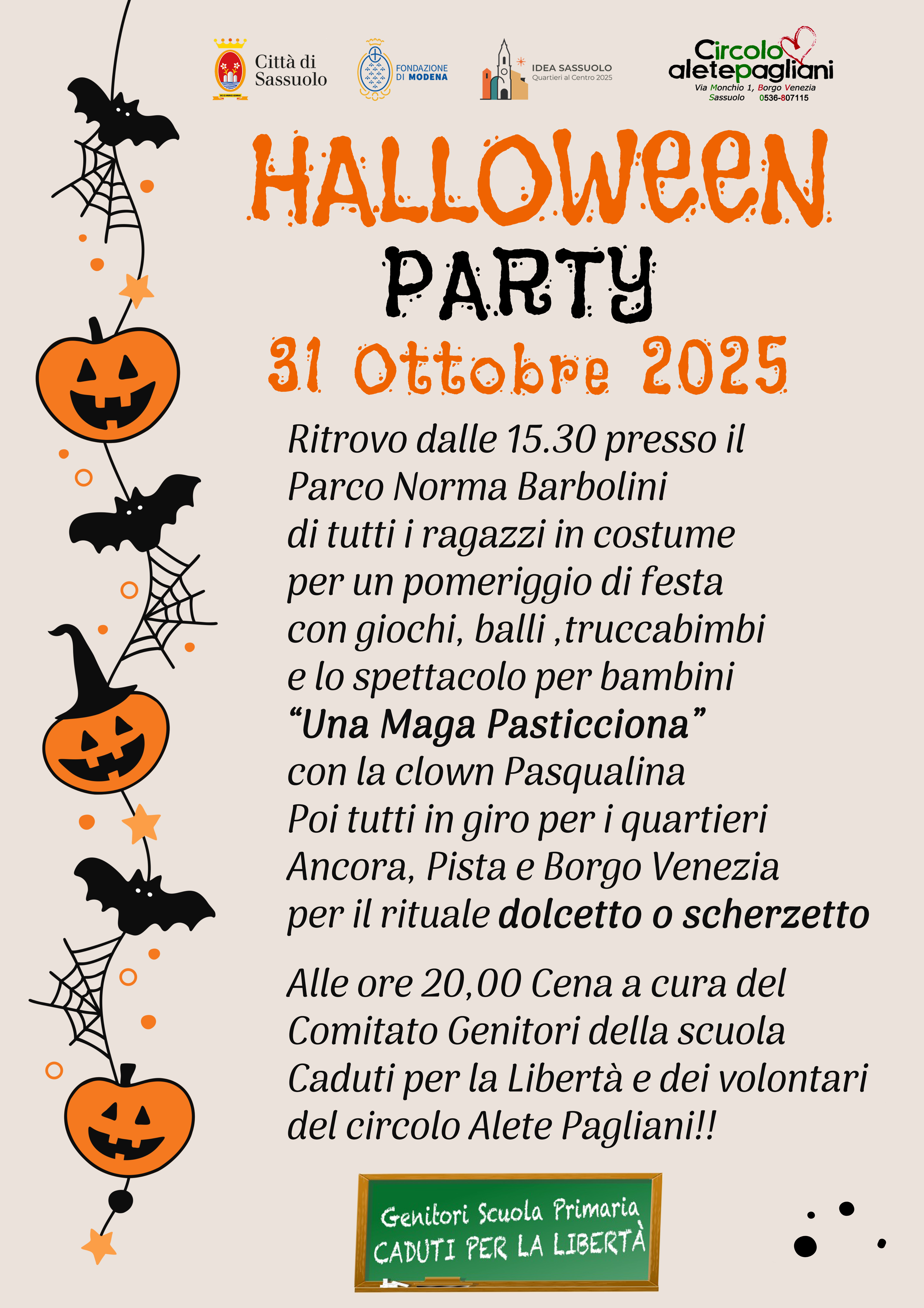 Sabato 31 ottobre si terrà la Festa di Halloween organizzata dal Circolo A. Pagliani con il patrocinio del Comune di Sassuolo e il sostegno di Fondazione di Modena nell'ambito di Idea Sassuolo. Quartieri al centro.