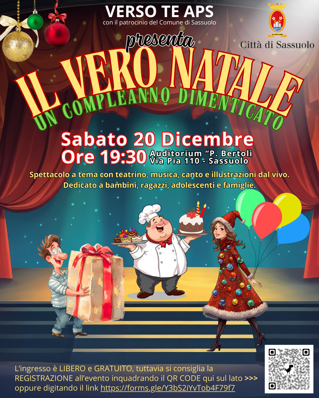 Sabato 20 dicembre alle ore 19:30 andrà in scena Il vero Natale - Un compleanno dimenticato presso l'Auditorium P. Bertoli a cura dell'associazione Verso Te APS.