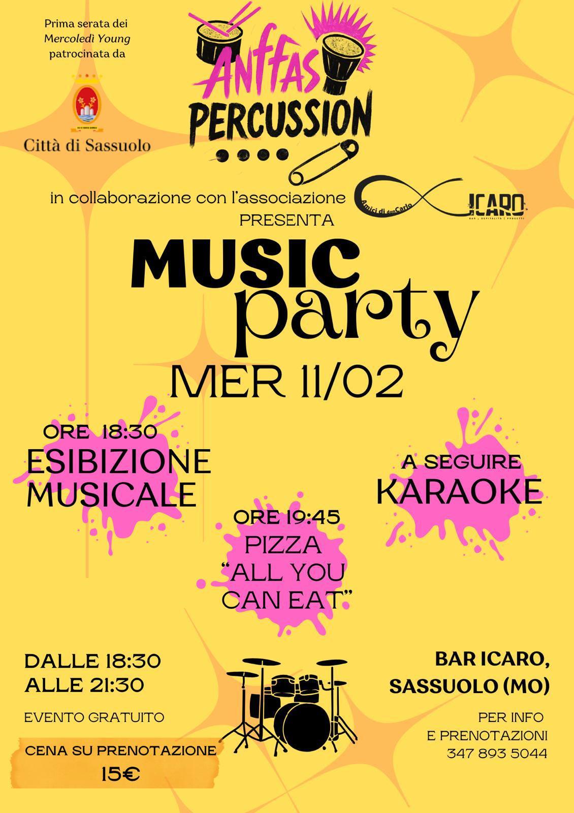 Anffas percussion in collaborazione con l'associazione Amici di don Carlo e Icaro presenta Music party! la prima serata del Mercoledì Young al Bar Icaro.